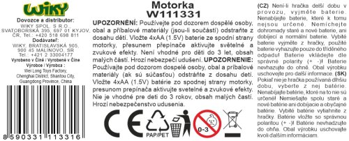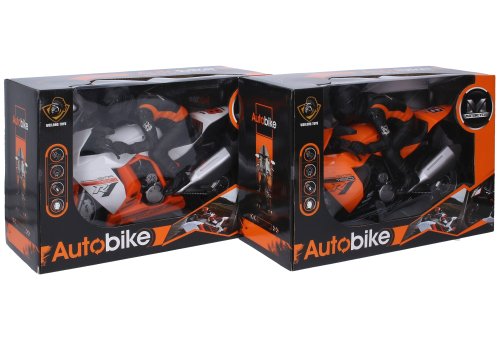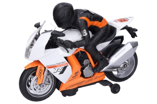 Závodní motorka s figurkou jezdce. Velikost 28 cm. Světelné a zvukové efekty. 4xAA baterie nejsou součástí. 2 varianty - oranžová, bílá.