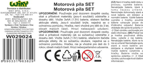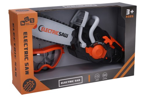 Motorová pila a ochranné brýle. Velikost pily 34 cm. 3xAA nejsou součástí. Vydává zvukové efekty. Aktivace tlačítkem na levé straně.
