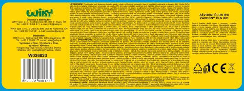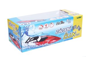 Závodní člun RC na dálkové ovládání - český obal. Rozměry 33x9,5x8 cm. Frekvence 2.4 GHz. 3.7V 500mAh bateriový pack do člunu součástí, 2xAA baterie do ovladače nejsou součástí. USB kabel součástí. Přepínač ON/OFF na ovladači.