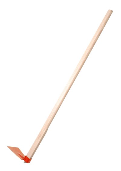 Plochá okopávací motyka s pracovní částí v kovovém provedení a s dřevěnou násadou.