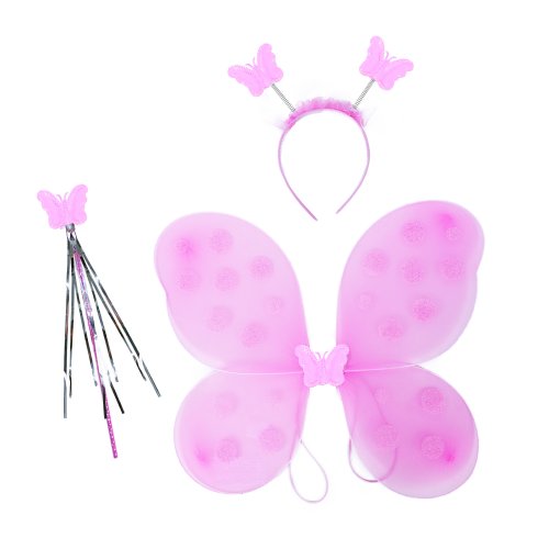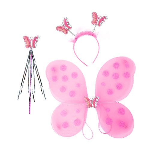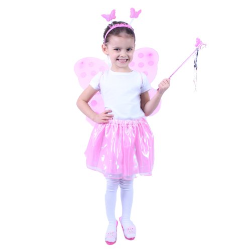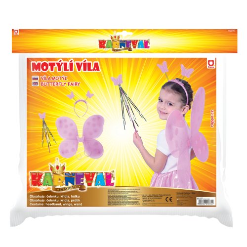 Roztomilá růžová motýlí křidélka na gumičku jsou určena pro holčičky ve věkovém rozmezí 3-10 let (104-150 cm). Součástí této karnevalové sady je také čelenka s motýlky na pružinkách a hůlka.