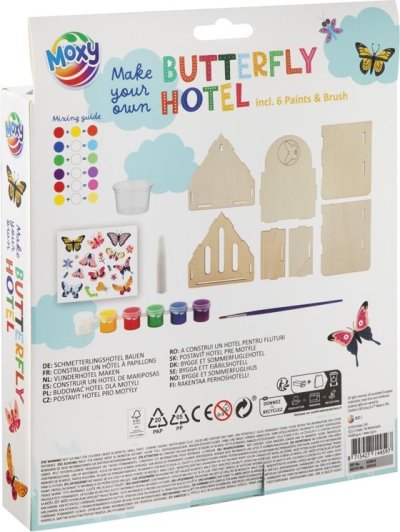 Balení obsahuje dřevěné (balsové) díly, akrylové barvy, štětec, lepidlo, obrázkový návod. Velikost domečku: cca 16 x 13 x 10 cm.