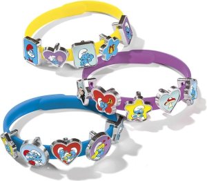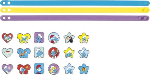 3x náramek (žlutý, fialový, modrý) 18x korálky s různými motivy šmoulů