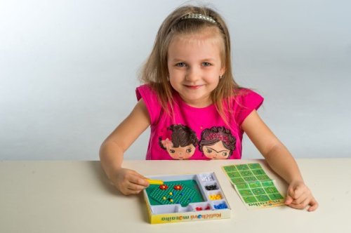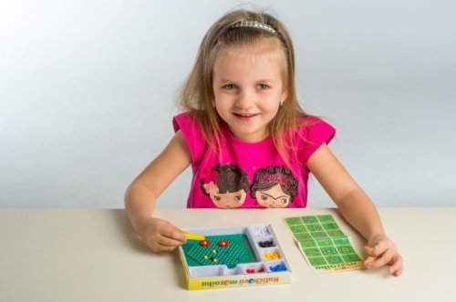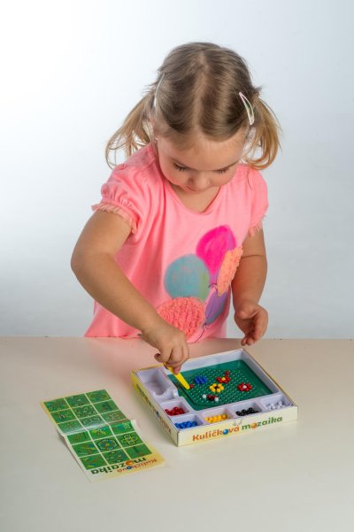 Za pomoci pinzety si děti skládají obrázky z barevných kuliček na podložku a tím si procvičují jemnou motoriku a šikovnost prstíků. Obrázky si mohou složit dle přiložených nákresů nebo dle své vlastní fantazie. Mozaika obsahuje 250 ks kuliček, pinzetu, oboustrannou destičku a papírové předlohy. Rozměr destičky: 12 x 12 cm, v krabičce Rozměr balení: 17 x 17 cm Vhodná od 3 let