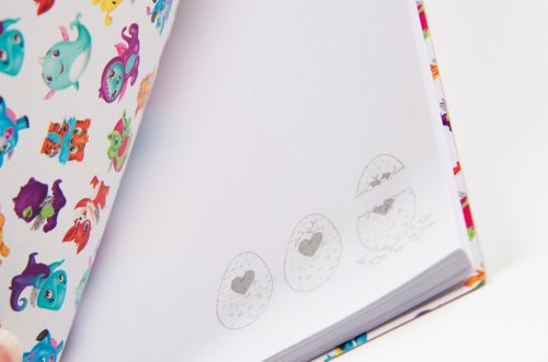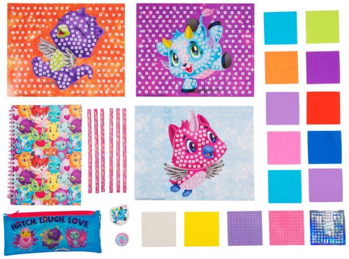 Mozaika zábavná Hatchimals – balení obsahuje zápisník, listy pro mozaiku s čísly, ořezávátko, gumu, penál na zip, 5 obyčejných tužek a samolepky.