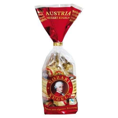 Mozartovy koule, tradiční pralinky plněné marcipánem (40%) a nugátovým krémem (33%) máčené v čokoládě