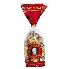 • Mozartovy koule, tradiční pralinky plněné marcipánem (40%) a nugátovým krémem (33%) máčené v čokoládě