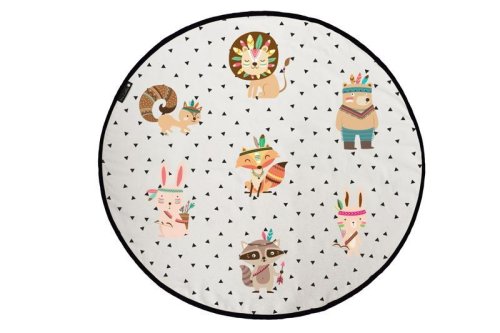 Potištěný hrací plátěný koberec s černým bavlněným okrajem .
