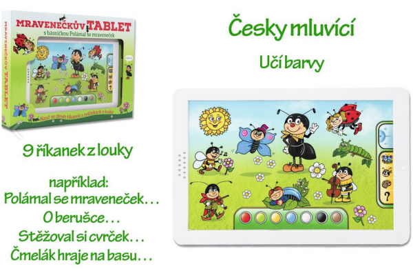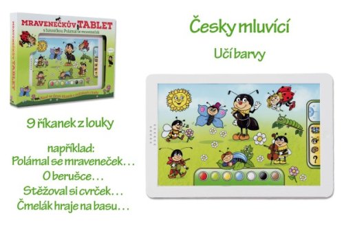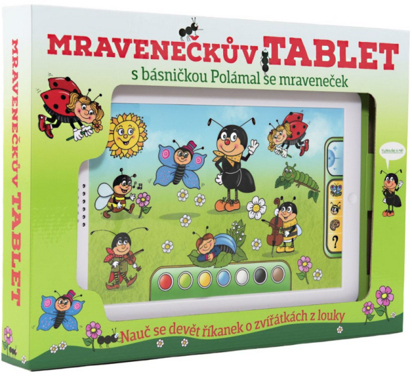Dotykový tablet, se kterým se děti naučí barvy, říkanky o zvířátkách z louky a poslechnou si známou básničku Polámal se mraveneček. Hračku uvedete do provozu dotykem prstu na kulaté tlačítko a dále používáte dotyků prstem ke zvolení funkcí: výuka barev, najdi, Mravenečkovi kamarádi (pod kterými se schovávají říkanky) a poslech básničky. Rozměr tabletu: 30 x 20 x 2 cm. Rozměry balení 38 x 28,5 x 5 cm. Vhodné od 12 měsíců