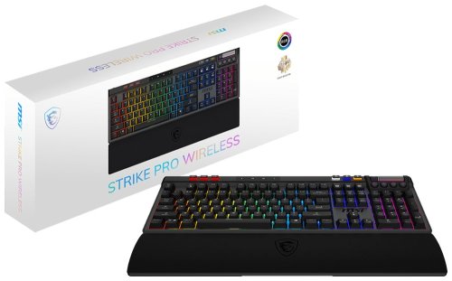 S výkonnou 4200mAh lithium-ion baterií poskytuje výdrž až 1500 hodin používání a nabíjí se za pouhých 7 hodin. Klávesnice je vybavena RGB podsvícením Mystic Light nastavitelným pro každou klávesu, magnetickou opěrkou zápěstí z paměťové pěny a pokročilou tlumicí konstrukcí pro minimalizaci nežádoucích zvuků.