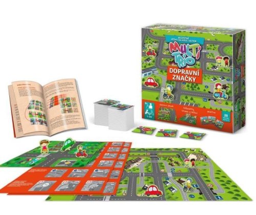 Multi-TRIO Dopravní značky je velký soubor her pro poznávání základních dopravních značek a dopravních situací. Slouží jako vhodný doplněk oblíbeného předmětu Dopravní výchova, přenesený do hravé formy stolní hry. Sada mimo jiné obsahuje podklady pro testy 20 dopravních situací, které se děti musí učit již v raném věku jako chodci nebo cyklisté. Další z herních variant jsou založeny na hledání dvojic či trojic kartiček, tak jak to znáte z jiných her české značky Pexetrio. A co vás tu čeká například za herní varianty? Pro věk 4–5 let: herní varianty pro první seznamování se s dopravními značkami (hra LOTO-TRIO a herní varianty hry Pexetrio) pro věk 5–7 let: herní varianty pro první cestování na plánu pomocí dopravních značek a přiložených figurek pro věk 6–8 let: herní varianty pro dopravní testy a jejich vyhodnocování, opět pomocí figurek a plánků křižovatek Charakteristika deskovky. Hra je doporučována od 4 let, kdy se děti aktivně zajímají o dopravu kolem nich. Nicméně jednodušší varianty her (například LOTO-TRIO, stavění figurek na dopravní plánek a povídání si o tom) zvládnout už i 3 leté děti. Některé z her jsou vhodné pro jednoho hráče, další si zahraje skupina až 6 hráčů. S Multi-triem Dopravní značky neuděláte chybu ani ve školce, školní družině či v hodinách prvouky. Každá z her trvá různou dobu a záleží jen na dětech, jak dlouho jsou ochotné si je hrát. Díky velkému množství herních variant tato sada jen tak neomrzí. Sada obsahuje72 kartiček = 24 dopravních značek - trojic: 1. obrázek = dopravní značka, 2. obrázek = situace při dodržení pravidel, 3. obrázek = porušení pravidel, které dopravní značka předepisuje.8 figurek chodců, cyklistů a motorových vozidel herní plán Dopravního hřiště pro testování různých dopravních situací (66 x 46 cm) 4 ks herních plánů pro herní varianty LOTO trio 8 ks herních plánů křižovatek pro Dopravní testy podrobný návod na všechny varianty přehled 24 dopravních značek, jejich přesné názvy, kódové označení, doslovné znění pravidel, které dopravní značky předepisují