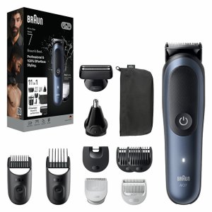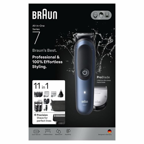 Profesionální sada pro kompletní péči o tělo, vlasy a vousy. Braun Series 7 AIO7540 nabízí až 11 funkcí v jednom zařízení a umožňuje rychlé, přesné a šetrné zastřižení nebo oholení od hlavy až k patě. Díky voděodolnému provedení a výkonné baterii je ideální i pro použití ve sprše.