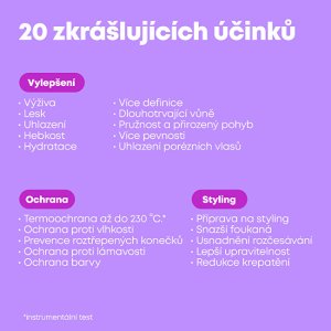 Všestranný bezoplachový sprej, který nabízí 20 účinků pro viditelně zdravější a krásnější vlasy. Lehká receptura je obohacena o aktivní látky, které společně dodávají vlasům lesk, hebkost, kontrolu nad krepatěním a mnoho dalších benefitů.