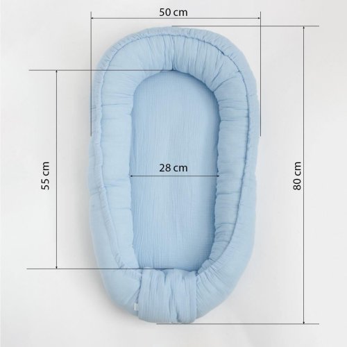 Mušelínové hnízdečko New Baby je vyrobeno uz prvotřídní bavlněné příze. Umožňuje umístit dítě do pohodlné polohy a hlavně může být dítě umístěné v kokonu stále v blízkosti maminky. Při cestování si můžete vzít hnízdečko s sebou, aby dítě připoutané k vůni domova a svému místu mohlo bezstarostně spát na jiném místě. Hnízdečko můžete umístit do postýlky, na pohovku, na zemi i do kočárku. Dítě v něm může spát, odpočívat nebo si hrát. Hnízdečko bude velkým pomocníkem ve vaší domácnosti. Určeno pro miminka od 0- 12 měsíců.
