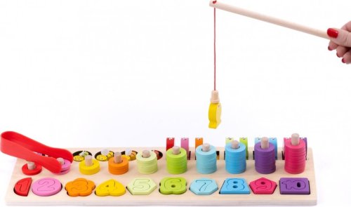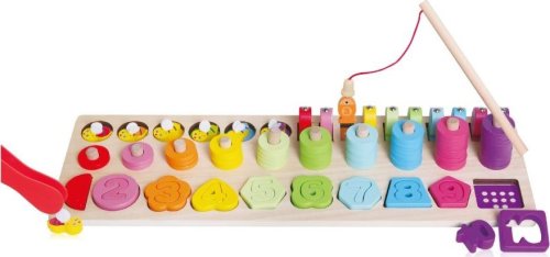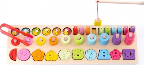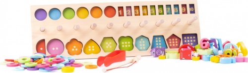 10 dřevěných tvarů 10 dřevěných číslic 6 včeliček ze dřeva 10 dřevěných rybiček s magnetem 1 dřevěná udice s magnetem 1 plastová pinzeta 55 dřevěných kroužků
