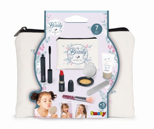 Kosmetická taštička Smoby My Beauty Make Up se rtěnkou, řasenkou, očními stíny, štětečkem, glitrovým pilníkem, krémem na ruce. Atrapy kosmetiky. Rozměry taštičky: 17,5 x 13,5 cm.