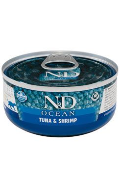 Tuňák, sardinky, krevety. Kompletní vlhké krmivo pro dospělé kočky.