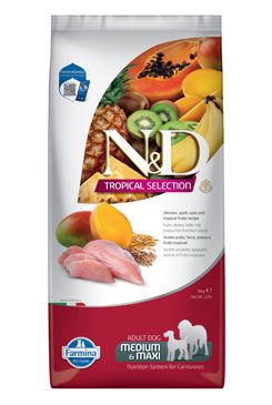 Kuře, špalda, oves a tropické ovoce. Kompletní krmivo pro dospělé psy.