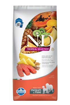 Losos, špalda, oves a tropické ovoce. Kompletní krmivo pro dospělé psy.