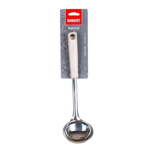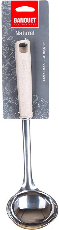 Naběračka NATURAL vyrobená z nerezové oceli, je určena pro profesionální i domácí použití. Naběračka je opatřena praktickým očkem pro možnost zavěšení, snadno se udržuje a lze mýt v myčce na nádobí. Řada kuchyňského náčiní NATURAL splňuje náročné požadavky profesionálů a je vhodná i pro domácí použití. Jednoduchý funkční design zabezpečuje nadčasovost a dlouhou morální i kvalitativní životnost všech výrobků. Držadlo je vyrobeno z polypropylenu a pšeničných otrub.