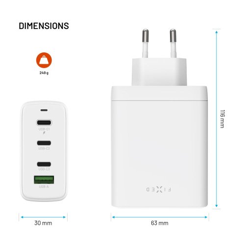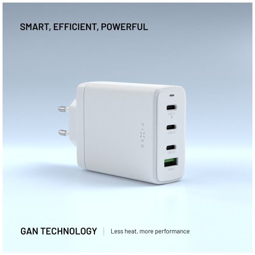 Univerzální síťová nabíječka FIXED GaN s výkonem 120 W nabije až 4 zařízení současně a díky moderní GaN technologii zůstává kompaktní a efektivní. Hlavní port USB-C1 s PD 3.0 zvládne i výkonné notebooky.