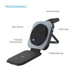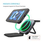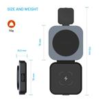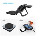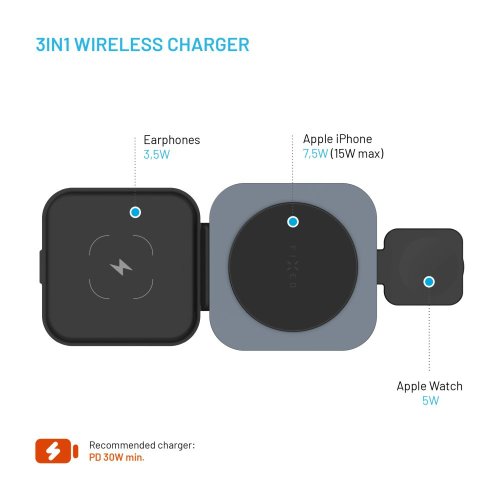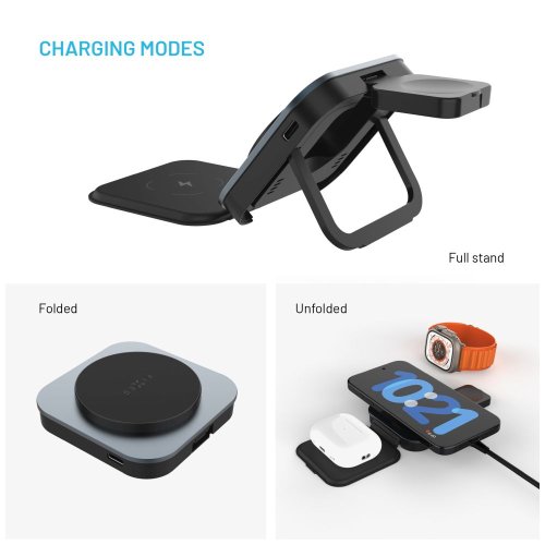 Po rozložení získáte hlavní nabíjecí plochu s podporou MagSafe, kde nabijete váš iPhone řady 12 a vyšší s výkonem max. 7,5 W. Smartphony jiných značek nabíjíte s výkonem max. 15 W. Výklopná plocha je speciálně vyhrazena pro nabíjení Apple Watch hodinek. Na třetí ploše s odolnou syntetickou kůží dobijete svá bezdrátová sluchátka. Na stav nabití vás upozorní LED indikátor.