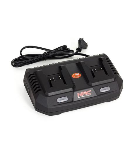 Dvojitou síťovou nabíječku 2x20 V NAC BC-LI-2×30-20V využijete k nabíjení lithium-iontových baterií z řady NAC AKUMULTISYSTEM 20V. Do dvou slotů vložíte současně dvě baterie.