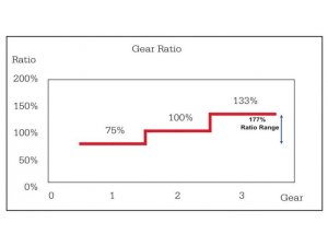 3-rychlostní volnoběžný náboj Sturmey-Archer S-RF3 s rozsahem 177%.