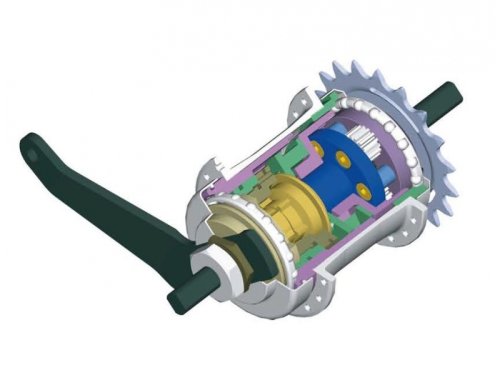 2-rychlostní náboj Sturmey-Archer S2C Kick-Shift s řazením nohou a rozsahem 138%.