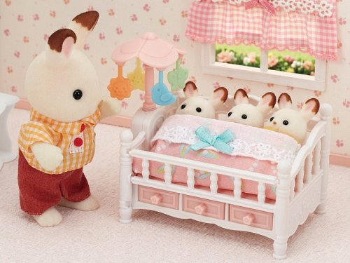 Tato rozkošná postýlka pro trojčátka s otočným kolotočem se může rychle proměnit na postel pro větší děti. Ve spodní části postele jsou tři šuplíčky na uložení náhradních přikrývek a povlečení. Otočením květiny na boku postýlky rozpohybujte dětský kolotoč. Užijte si více zábavy s dalšími figurkami a doplňky Sylvanian Families (prodává se samostatně). Herní sady a figurky Sylvanian Families jsou nadčasové a vysoce kvalitní hračky. Hra podněcuje představivost dítěte. Sada obsahuje: 1x postýlka, 3x šuplíčky, 1x otočný kolotoč, 1x přikrývka. Věk: 3+