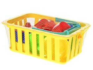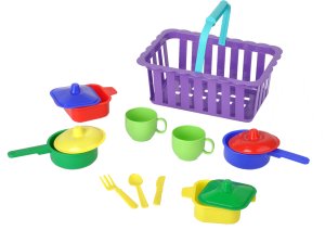 Nádobí v košíku udělá radost každé malé kuchařce a hospodyňce.. Košík obsahuje dva hrnce, dvě pánvičky, dva hrníčky a příbory. Nádobí má různě barevné kombinace. Díky košíku je možné nádobí prakticky uskladňovat, což ocení především maminky.