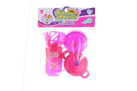 Sada obsahuje hrnec, pánev, 2 hrnečky, obracečku, a příbor. Materiál plast. Rozměr balení cca 21 x 17 cm. Věk 3+