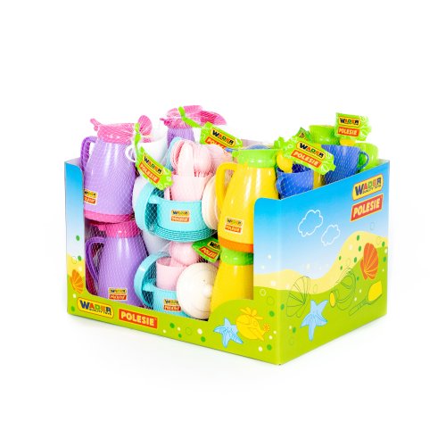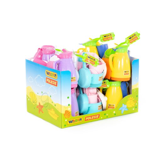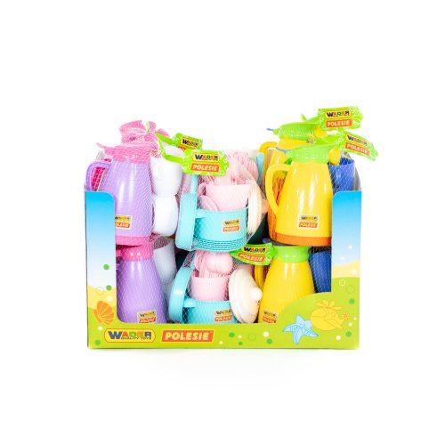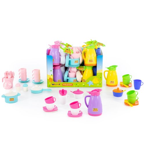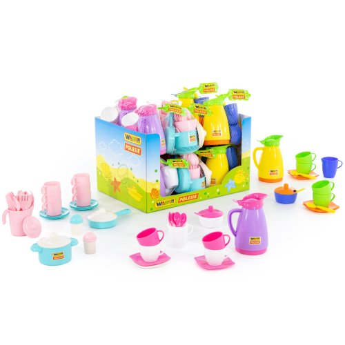 Růžovo-bílý set s fialovou konvičkou: konvička, 4 hrníčky, 4 podšálky, 4 lžíčky, cukřenka, mlékovka Barevný set s konvičkou: konvička, 4 hrníčky, 4 podšálky, 4 lžíčky, cukřenka, mlékovka Barevný set bez konvičky: 6 hrníčků, 6 talířků, 6 lžiček, 6 vidliček a nožíků, solnička, pepřenka, hrnec s pokličkou, pánvička Doporučený věk: o