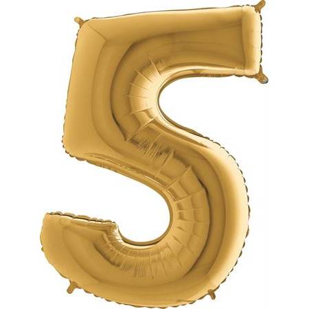 Zlatý balónek číslo 5. Balónek je vyrobený z pevné fólie.