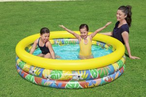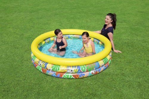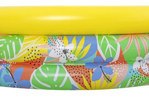 Bazén je vyroben z odolného PVC materiálu, který zajišťuje pevnost a dlouhou životnost. Konstrukce sestává ze tří nafukovacích komor, které jsou vybaveny bezpečnostními ventily pro snadné a bezpečné nafouknutí i vyfouknutí. Design bazénu je výrazný a veselý, s tropickým motivem listů a květin v jasných barvách – zelená, modrá, žlutá a oranžová – které přinášejí do každého dvora atmosféru tropického ráje. Vrchní prstenec je žlutý, což kontrastuje s barevným vzorem spodních dvou prstenců, a zajišťuje stabilitu a pevnost celé konstrukce.