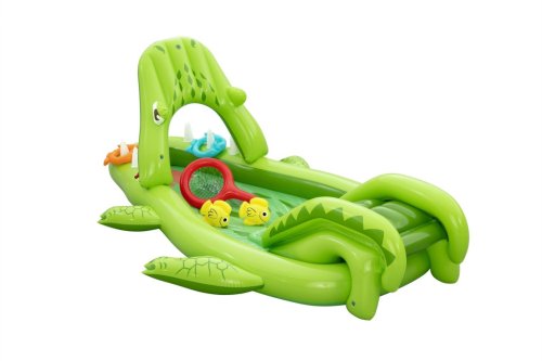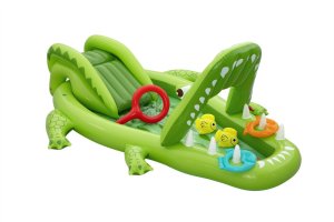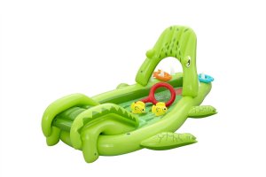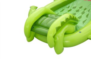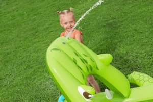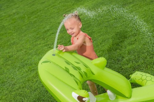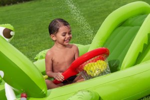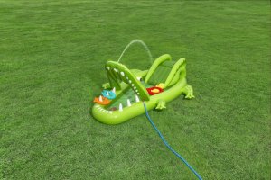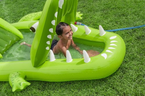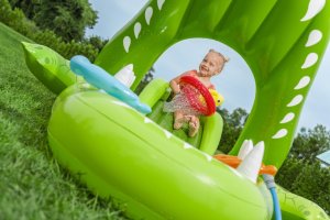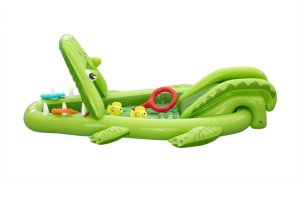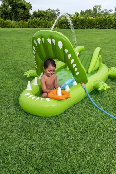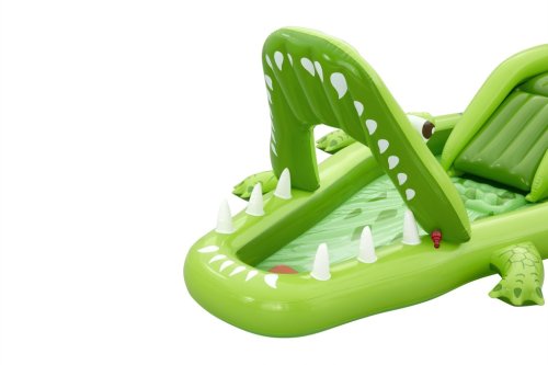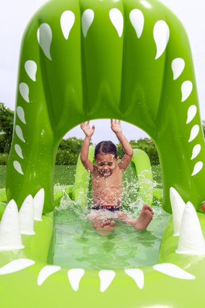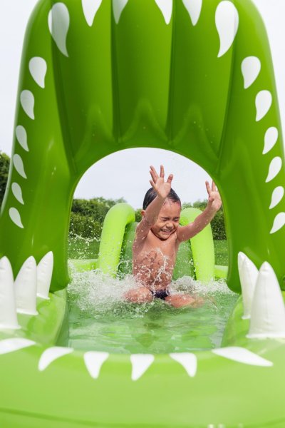 Ponořte se do tropického světa s vodním hracím centrem Later Gator™. Toto působivé herní centrum v designu Aligátora s otevřenou tlamou slibuje hodiny zábavy a dobrodružství pro děti od 2 let. Jednoduše připojte zahradní hadici k aligátoří tlamě s integrovaným zavlažovačem, který okamžitě začne kropit skluzavku s měkkým polštářem. Bazének, skluzavka i vodní rozprašovač tak tvoří jedno velké vodní dobrodružství. Součástí sady jsou: 2 nafukovací rybičky Puffy Pal™, 2 házecí kroužky ve tvaru rybky, nafukovací podběrák a opravná záplata. Bazénová část s kapacitou 152 litrů nabízí prostor pro dovádění ve vodě a díky integrovanému vypouštěcímu ventilu ji lze snadno vyprázdnit. Odolný PVC materiál zajišťuje dlouhou životnost i při aktivním hraní. Maximální nosnost: 45 kg. Rozměry v nafouknutém stavu: 87 x 163 x 234 cm. Rozměry ve vyfouknutém stavu: 174 x 215 cm. Rozměry balení: 30 x 33 x 11 cm. Používejte pouze pod dohledem dospělé osoby. Věk: 2+
