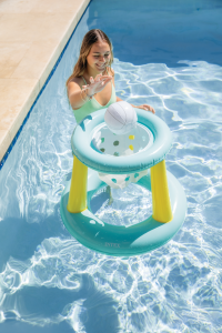 Nafukovací hra Velký basketbalový koš je ideální zábavou pro děti od 6 let, která zpestří každé koupání v bazénu. Tento produkt je vyroben z odolného PVC materiálu, který je příjemný na dotek a zajišťuje dlouhou životnost i při častém používání ve vodě. Basketbalový koš je navržen tak, aby volně plaval na hladině bazénu a umožňoval pohodlnou hru přímo ve vodě. Jeho konstrukce je tvořena dvěma nafukovacími kruhy v pastelově modré barvě, mezi kterými jsou tři pevné žluté sloupky, které zajišťují stabilitu a pevnost.