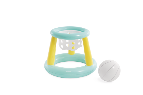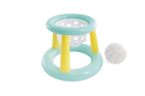 Koš je doplněn o síťku z bílého materiálu s pravidelně rozmístěnými kruhovými otvory, která je připevněna pod horním kruhem a slouží k zachytávání míče. Součástí balení je i nafukovací basketbalový míč ve stejné bílé barvě s šedými linkami, který je dostatečně lehký a plave na vodě, což usnadňuje hru a zvyšuje zábavu. Díky svému kompaktnímu designu a světlým barvám je hra dobře viditelná na vodní hladině a snadno se stává středem pozornosti během bazénových aktivit.