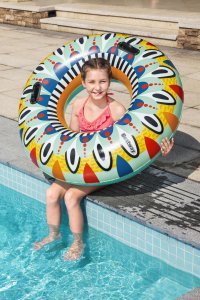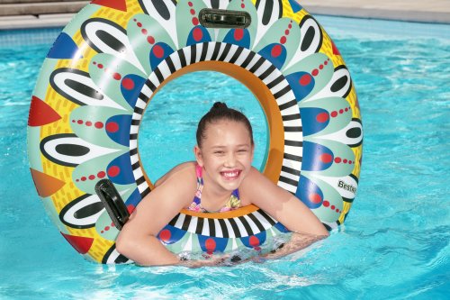 Nafukovací kruh o průměru 107 cm je vyroben z pevného a odolného vinylového materiálu. Kruh má veselý barevný design a dvě pevná držadla. Maximální nosnost je 100 kg.