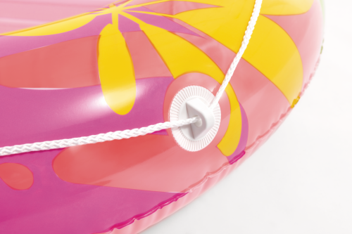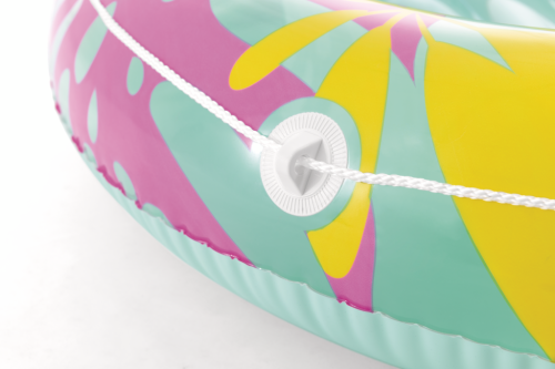 Lehátko je vyrobeno z kvalitního PVC materiálu s atraktivním tropickým vzorem, který kombinuje různé odstíny zelené, žluté, růžové a fialové barvy. Tento barevný design působí svěže a letně, přináší do bazénu nebo na vodní plochu příjemnou atmosféru. Okraj lehátka je navíc opatřen bílým lanem, které je pevně uchyceno a usnadňuje držení či manipulaci s lehátkem na vodě.