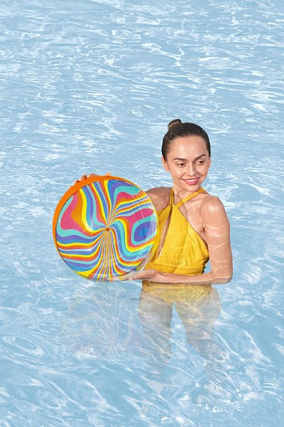 Originální, nafukovací míč Bestway do vody s motivem Tie-Dye Twist™ a jednou transparentní polovinou Ø 34 cm. Udělejte sobě a svým dětem radost a užijte si ve vodě spoustu zábavy. Vyrobeno z kvalitního a odolného PVC. Používejte pouze pod dohledem dospělé osoby a ve vodě, kde dítě dosáhne na dno. Rozměry nafouknutého míče: Ø 34 cm. Rozměry nenafouknutého míče: 46 x 34 cm. Rozměry balení: 29 x 17 x 1,7 cm. Věk: 2+