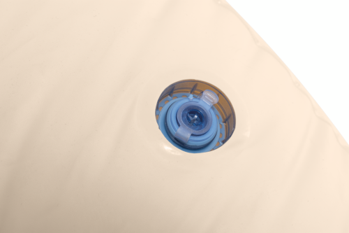 Materiál vaku je hladký a příjemný na dotek, což přispívá k celkovému komfortu uživatele. Nafukovací konstrukce umožňuje snadné nafouknutí i vyfouknutí, přičemž dva pevné ventilky jsou zajištěny modrými uzávěry, které zabraňují úniku vzduchu a zároveň umožňují rychlou manipulaci při nafukování nebo skladování. Díky tomu lze vak po použití kompaktně složit a uskladnit, což ocení zejména uživatelé s omezeným prostorem.