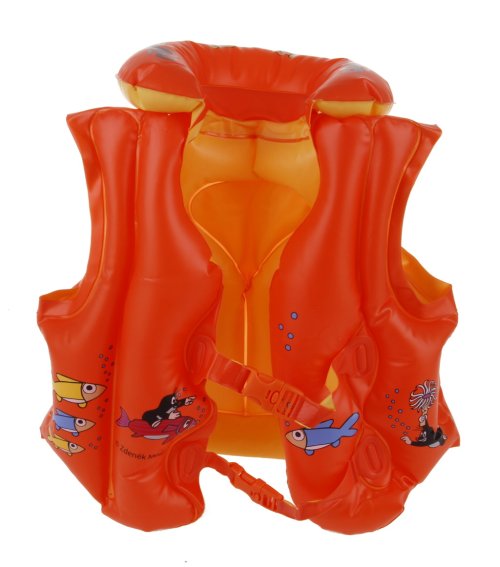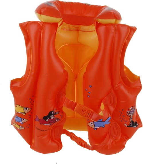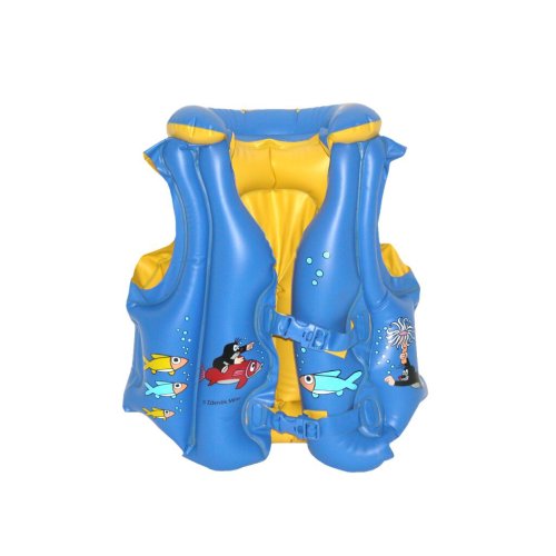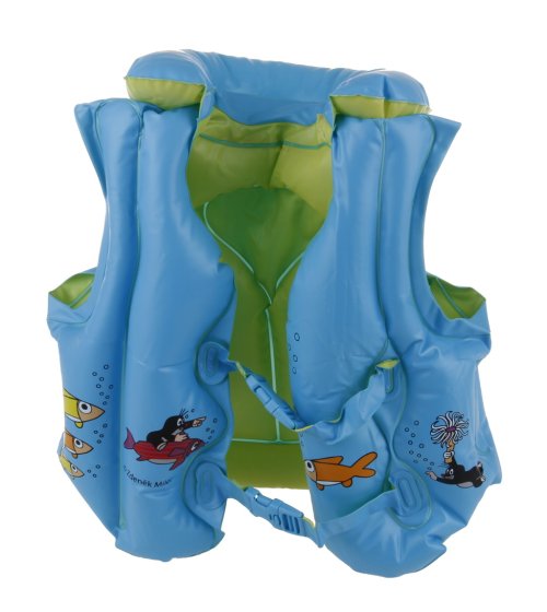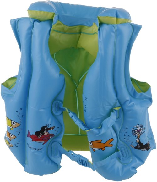 Dětská plavací vesta s motivy Krtečka a jeho kamarádů je skladná, bezpečná, snadno se nafukuje a vyfukuje. Je bez ftalátů a s bezpečnostními ventily. Děti mohou využít vestičku buď ke hře ve vodě nebo k výuce plavání. Vesta má nafukovací límce a nastavitelné přezky.
