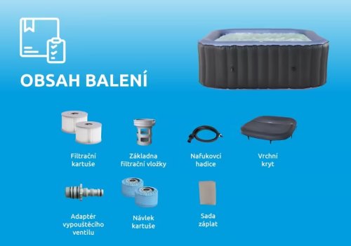Poznámka: Při poklesu teploty venku pod 4 °C je nutné před nafouknutím nechat plášť vířivky aklimatizovat v teplé místnosti po dobu 24 hod. Po nafouknutí je nutné ji ihned napustit vodou a zapnout ohřev.