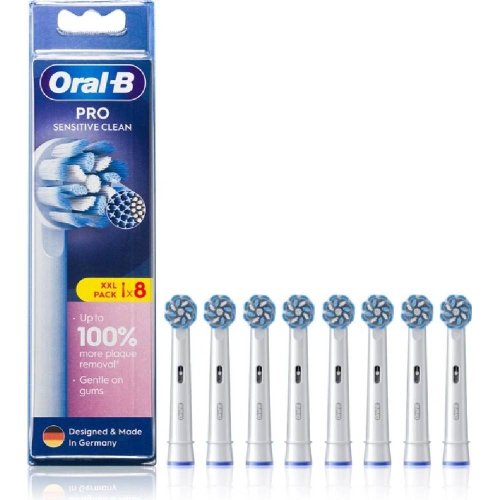 Kartáčková hlava Oral-B Sensitive Clean obsahuje kombinaci extra měkkých vláken, která jsou šetrná k dásním, a běžných vláken, která jsou nekompromisní k zubnímu plaku. V porovnání s běžným manuálním zubním kartáčkem odstraňuje až o 100 % více zubního plaku a o 100 % snižuje zánět dásní. Originální kartáčkové hlavy Oral-B jsou navrženy s novými vlákny ve tvaru X, která čistí v místech, kam kulaté hlavy nedosáhnou. Ukazatel opotřebení kartáčkové hlavy změní vlákna ze zelené barvy na žlutou a ukazuje tak, kdy je hlavu nutné vyměnit pro 100% účinnost čištění. Zaručená kompatibilita se všemi dobíjecími zubními kartáčky Oral-B, s výjimkou zubních kartáčků Pulsonic a iO.