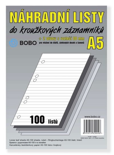 Náhradní listy formát A5, 100 listů. br brSada náhradních linkovaných listů do kroužkových záznamníků. Sada obsahuje 100 listů linkovaného bezdřevého papíru formátu A5, který je opatřen 6 dírami pro vložení do kroužkové mechaniky.