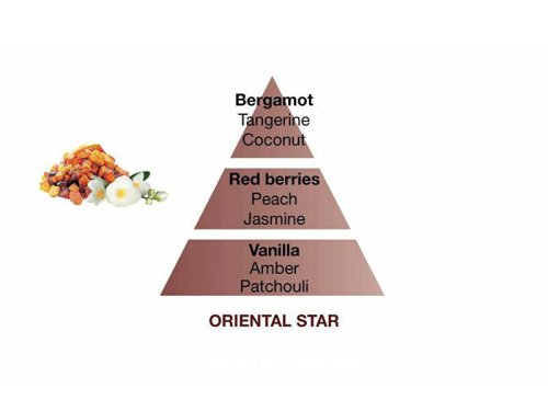 Náplň do difuzéru do auta, který lze snadno připevnit pomocí plastového klipu na průduchy klimatizace. Intenzita vůně je vyznačena na obalu číslem 1–5. Hřejivý a smyslný interiérový parfém, který je plný opulentních a jiskřivých ingrediencí s pikantními a zářivými notami. Ve vysokých tónech vás naladí souhra bergamotu, mandarinky a kokosového kořechu, která dodává tu správnou orientální notu. Střední tóny pak povzbudí vaše chuťové buňky díky vůni mixu červeného ovoce a broskve, doplněné mystickým jasmínem. Nízké tóny parfému tvoří sladká vanilka, ambra a pačuli.Složení vůně: hlava: bergamot, mandarinka, kokosový ořech,srdce: červené ovoce, broskev, jasmín,základ: vanilka, ambra, pačuli.