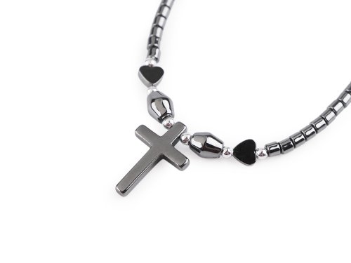 Poutavý náhrdelník vyrobený z korálků pokoveného hematitu a kvalitní nerezové oceli patří mezi šperky, které zaujmou na první pohled. Uprostřed je ozdobený výrazným přívěskem. Díky své univerzálnosti snadno doplní jakýkoliv outfit. Zapíná se na karabinku a prodlužovací řetízek.