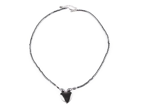 Poutavý náhrdelník vyrobený z korálků pokoveného hematitu a kvalitní nerezové oceli patří mezi šperky, které zaujmou na první pohled. Uprostřed je ozdobený výrazným přívěskem. Díky své univerzálnosti snadno doplní jakýkoliv outfit. Zapíná se na karabinku a prodlužovací řetízek.