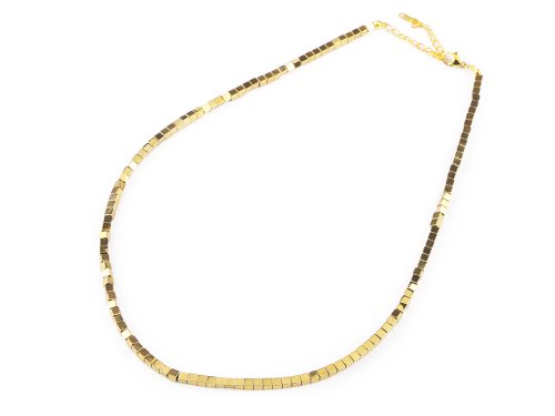 Poutavý náhrdelník vyrobený z kostiček pokoveného hematitu a kvalitní nerezové oceli je velice elegantní, patří mezi šperky, které díky své fascinující povrchové úpravě zaujmou na první pohled. Náhrdelník potěší každou ženu, je dárkem, se kterým nešlápnete vedle. Hodí se ke slavnostním příležitostem, skvěle podtrhne i business styl oblékání. Zapíná se na karabinku a prodlužovací řetízek.